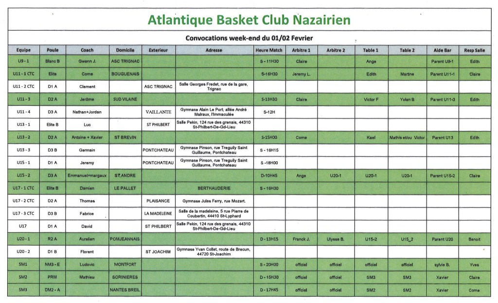 Planning du week-end 01/02 février