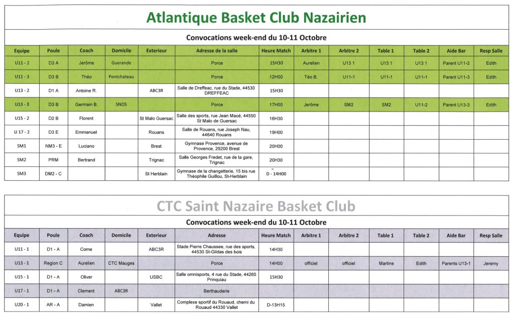 Planning du week-end 10/11 octobre