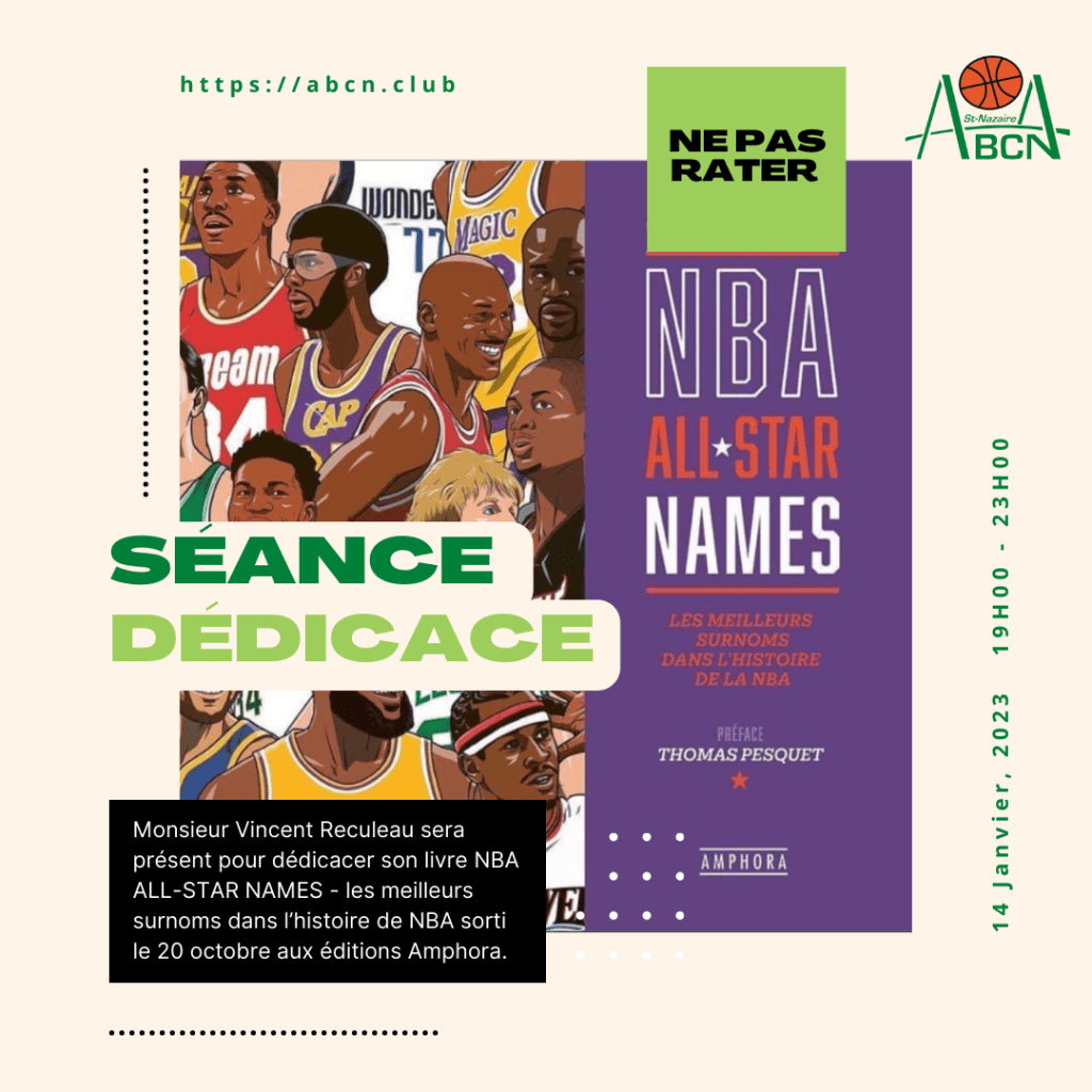 Monsieur Vincent Reculeau sera présent pour dédicacer son livre NBA ALL-STAR NAMES – les meilleurs surnoms dans l’histoire de NBA sorti le 20 octobre aux éditions Amphora.