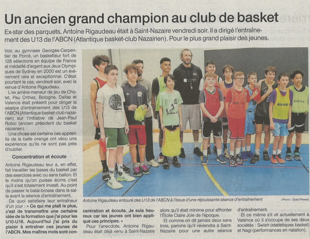 L’ABCN se retrouve dans le Ouest France après la venue d’Antoine Rigaudeau ce vendredi 27 Janvier au gymnase Georges Carpentier. Il a pu transmettre son expérience et ses connaissances auprès de nos jeunes basketteurs.